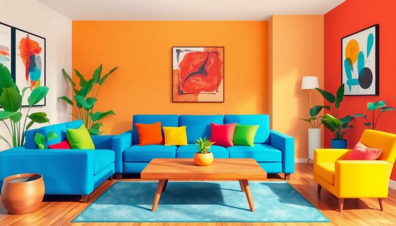Living rooms benefit from vibrant color choices that encourage social interaction. Warm tones, like orange and yellow, infuse energy, promoting conversation and activity. A bold accent wall can serve as a focal point, making the space feel inviting. Bright accessories, such as cushions and art pieces, add depth and visual interest without overwhelming the design. Combining neutrals with vibrant colors creates a balanced aesthetic, allowing warmth to shine while maintaining harmony. Statement furniture, like a vivid sofa or eclectic chairs, enhances the overall appeal, drawing attention and stimulating creativity in the space.