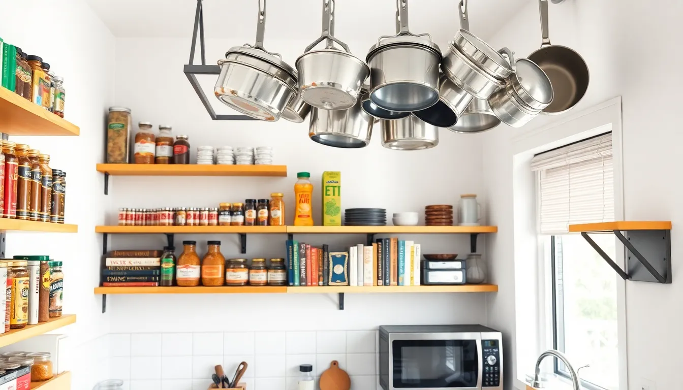 Hanging pots and pans frees up cabinet space while adding a decorative touch. Install a pot rack or mounting hooks on the walls or ceiling. Using this method keeps cookware visible and within reach. Choose a location above the kitchen island or prep area for convenience during meal preparation. Hanging utensils like spatulas or ladles alongside cookware maximizes space and efficiency. This organization technique promotes a tidy kitchen environment while showcasing culinary tools.